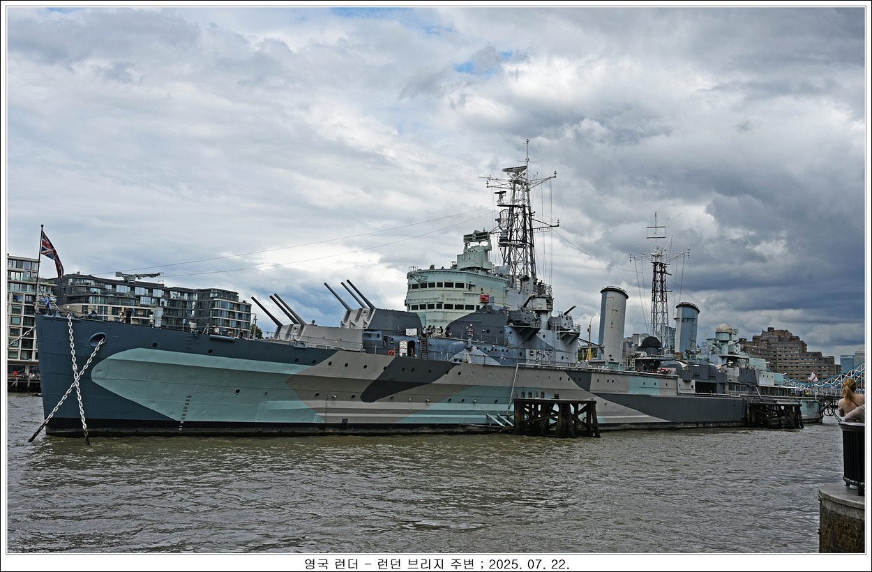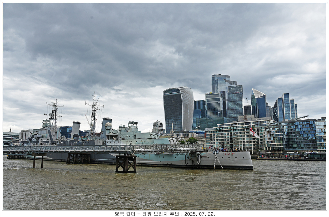템즈강을 따라 런던 브리지에서 타워브리지로 갑니다, 군함인 듯한 배가 있습니다