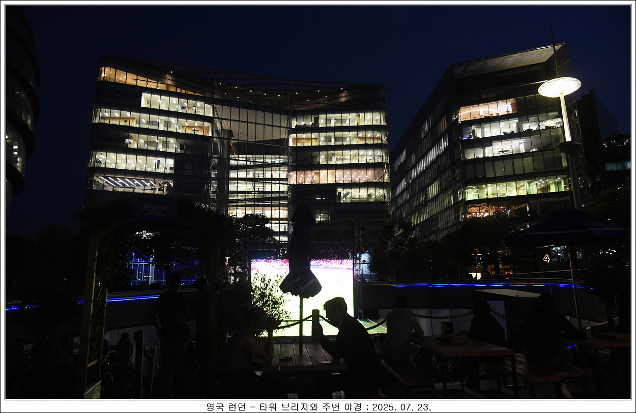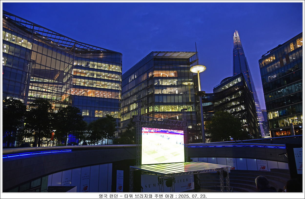 런던 브리지로 가서 강을 따라 가면서 구경합니다, 영국은 축구의 나라입니다, 야외에 티비가 있는데 축구경기를 하고 있네요