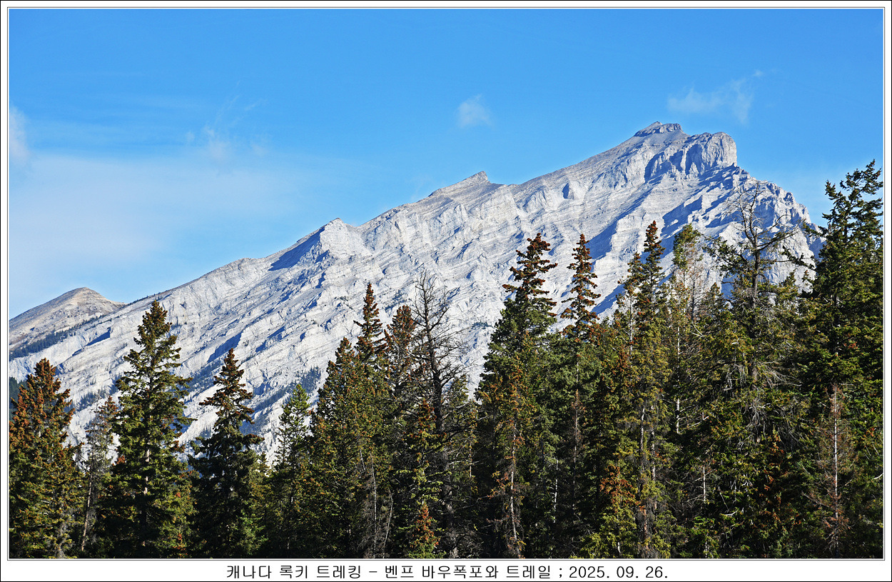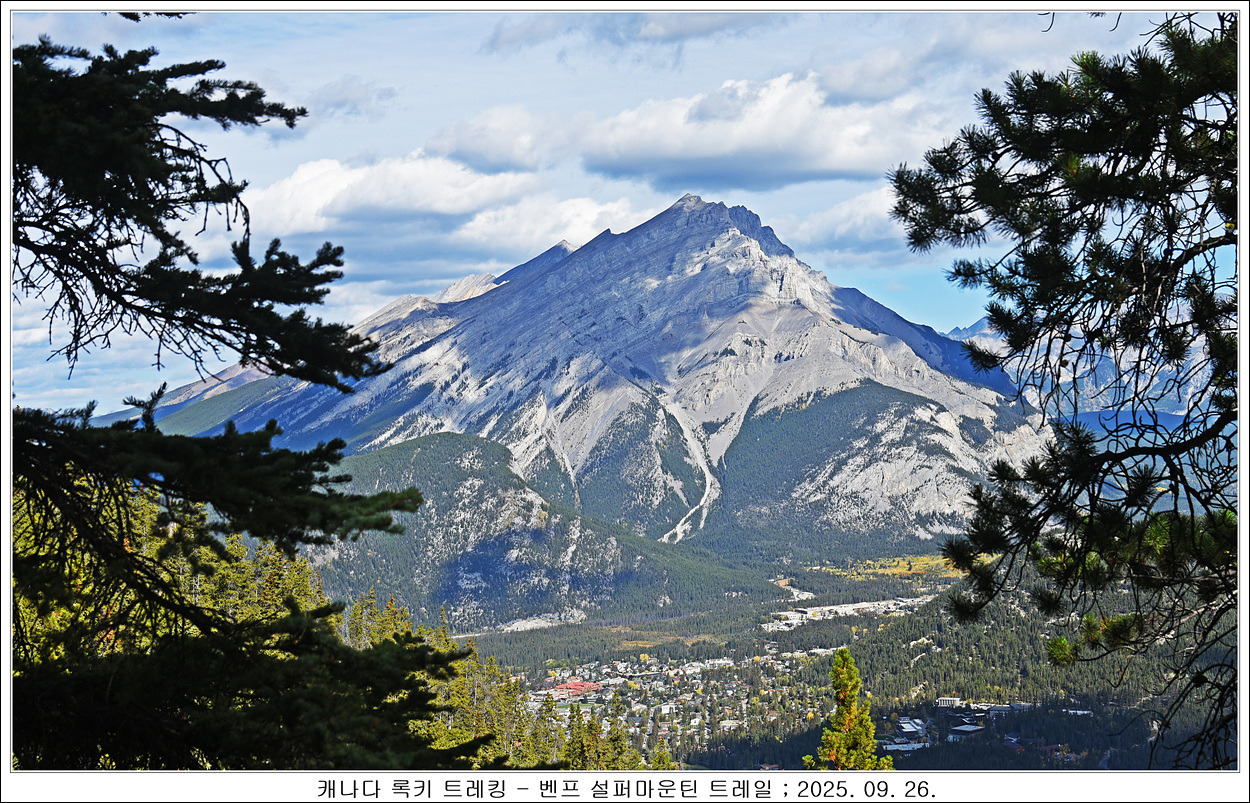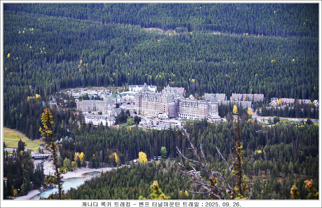 걸어 올라가면서 침엽수림으로 조망이 잘 보이지 않는데 조금씩 볼수 있었는데 밴프 시내가 보이고 보이는 산은 캐스케이드산인 듯 합니다