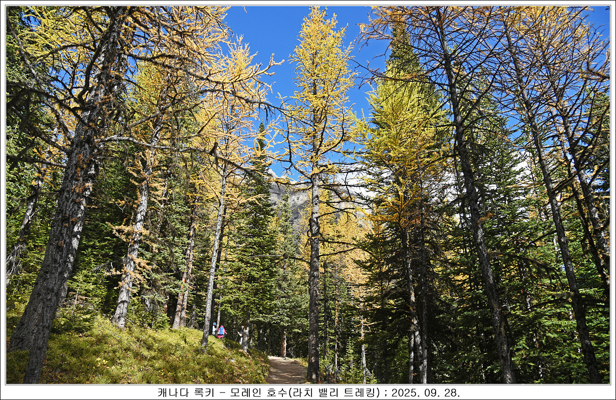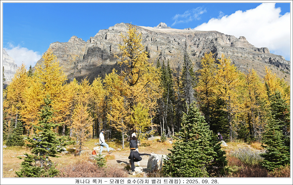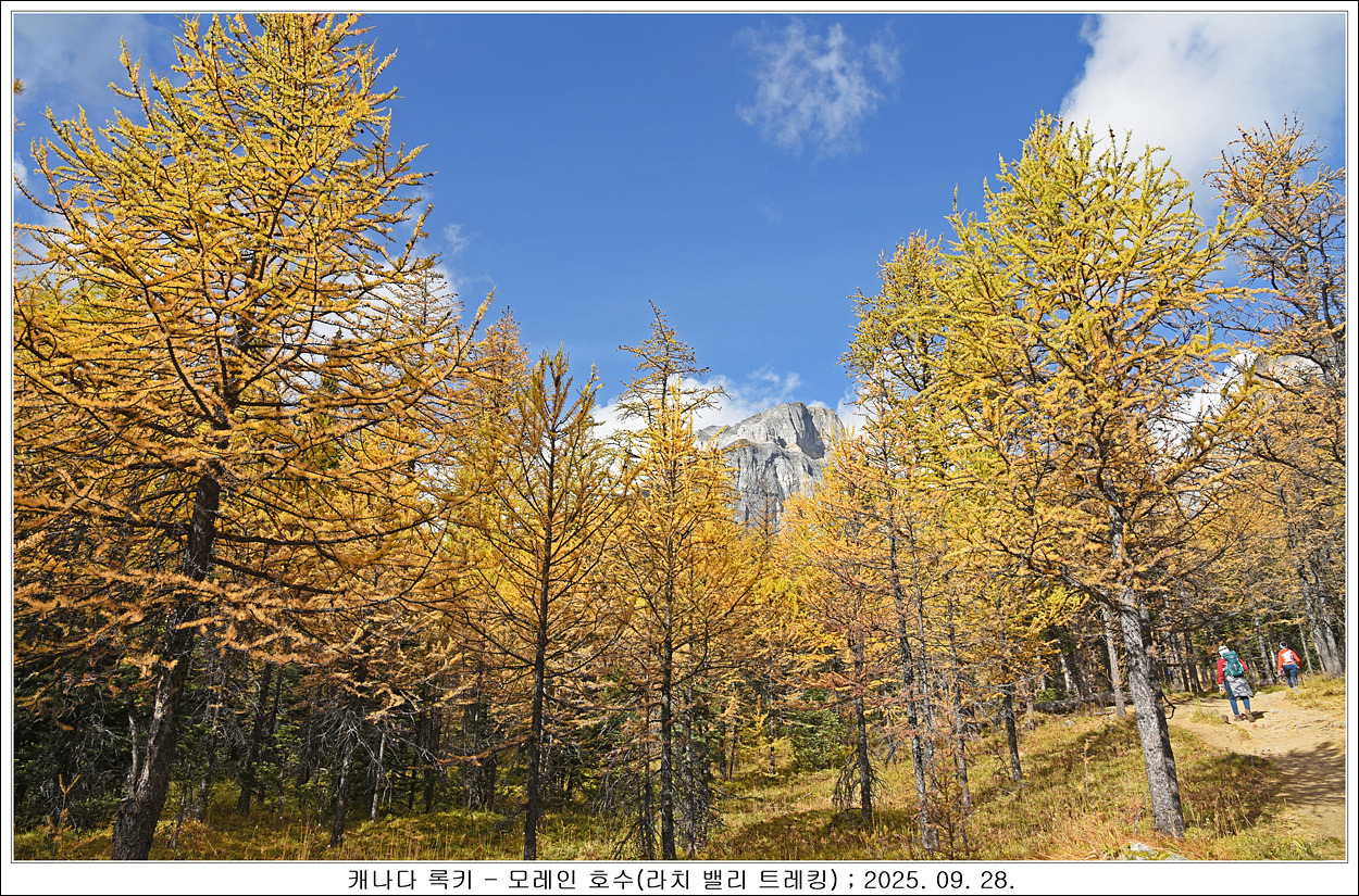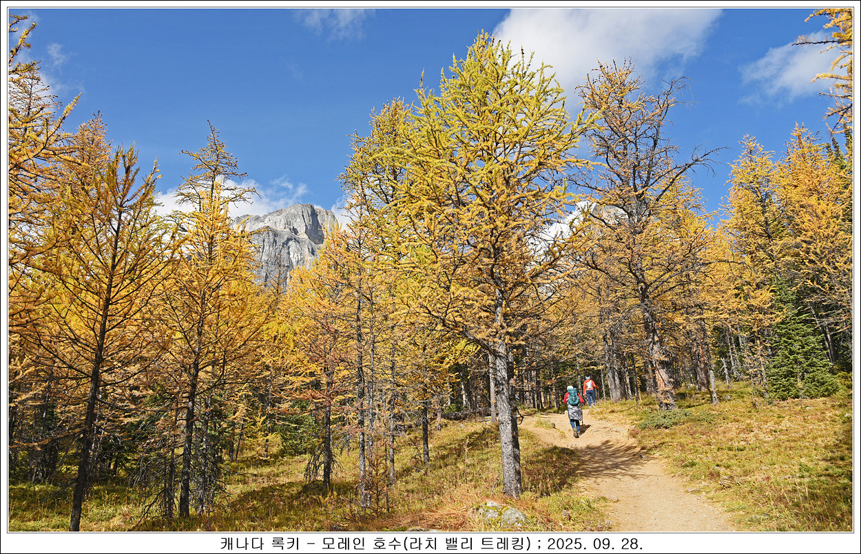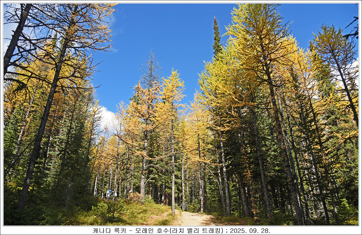 오늘은 모레노 호수와 라치벨리 트레킹입니다, 라치벨리 주변은 낙엽송의 노란 단풍으로 록키는 가을 여행도 괜찮다는 생각이 듭니다