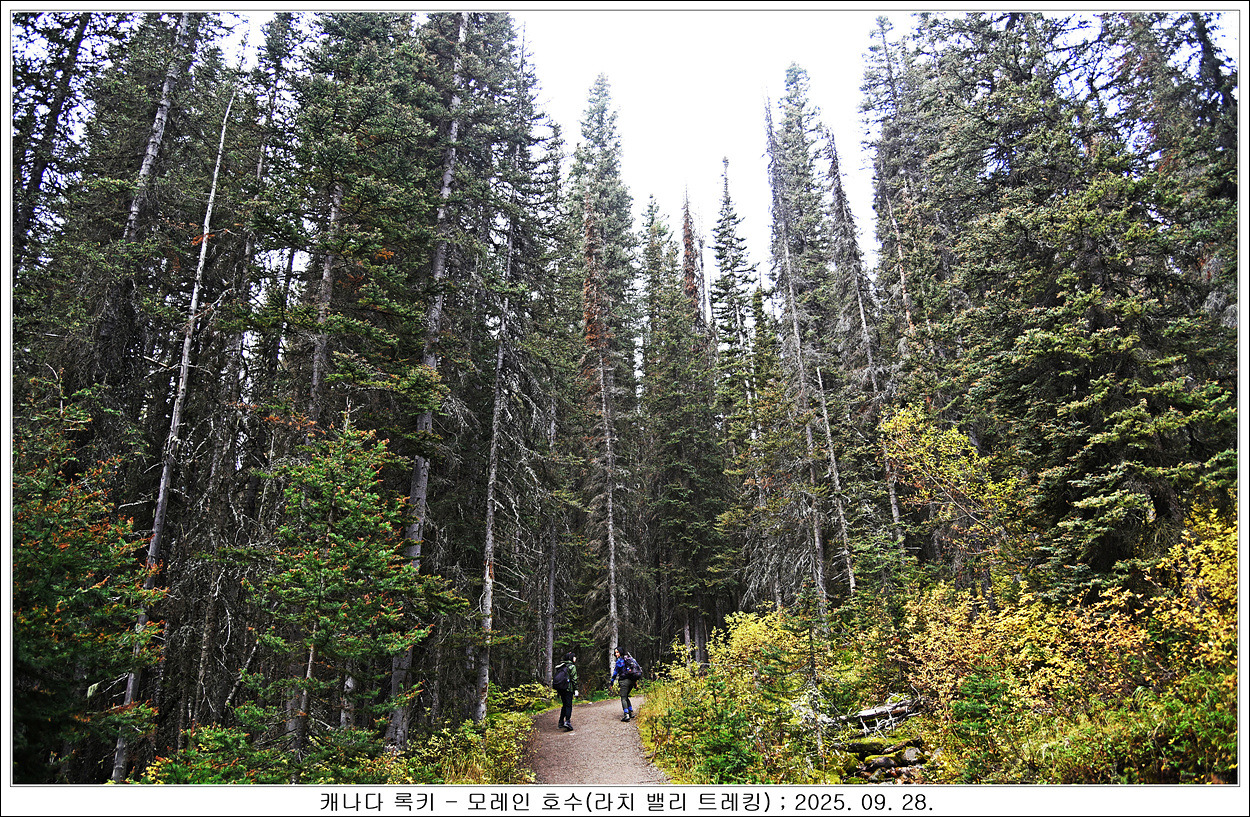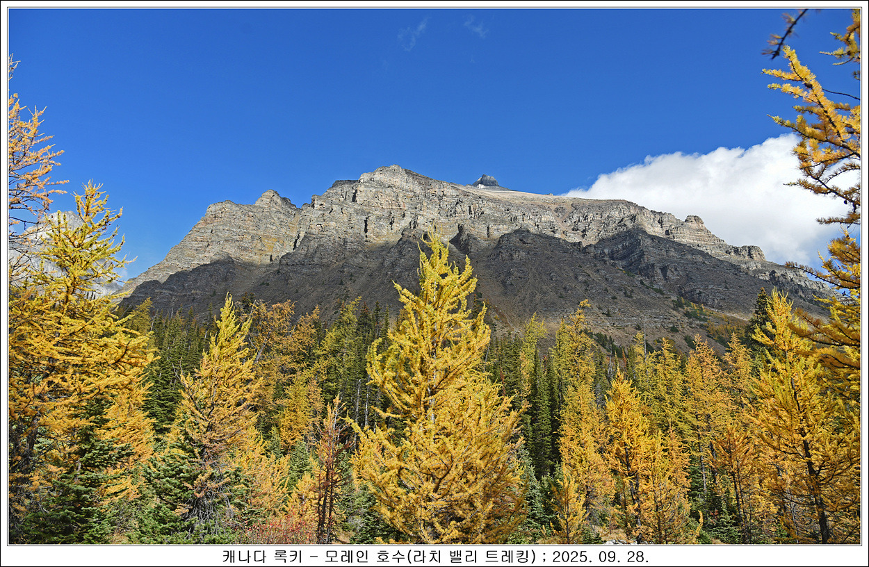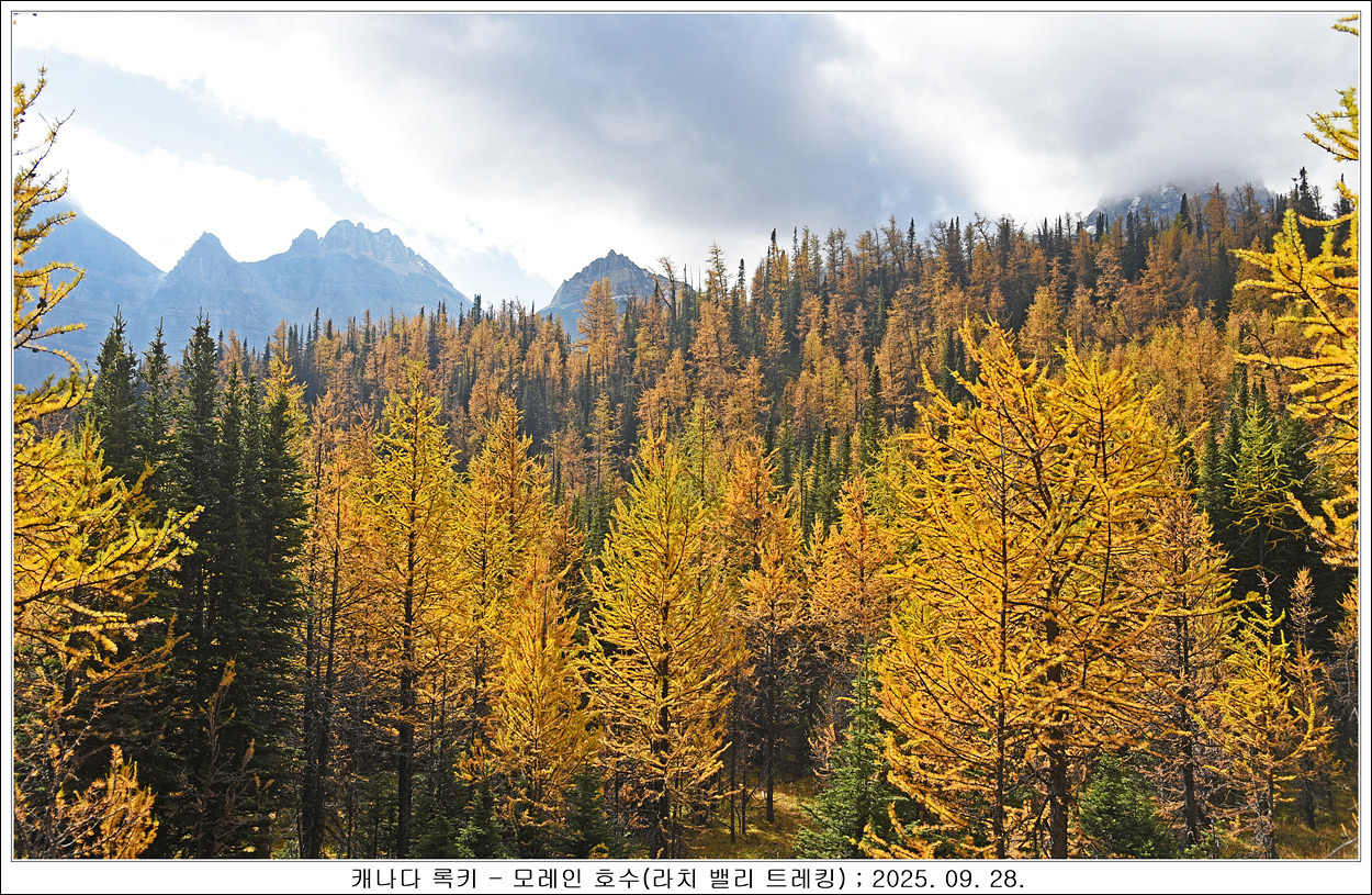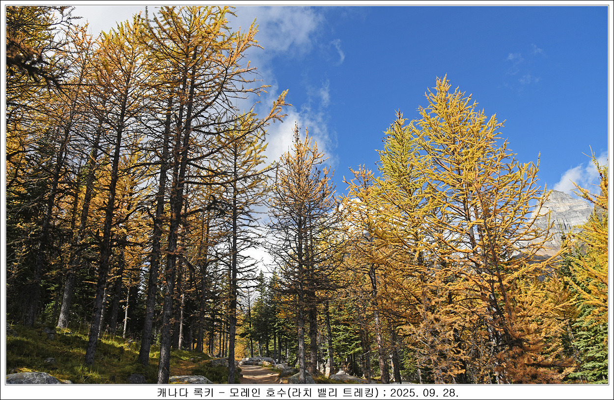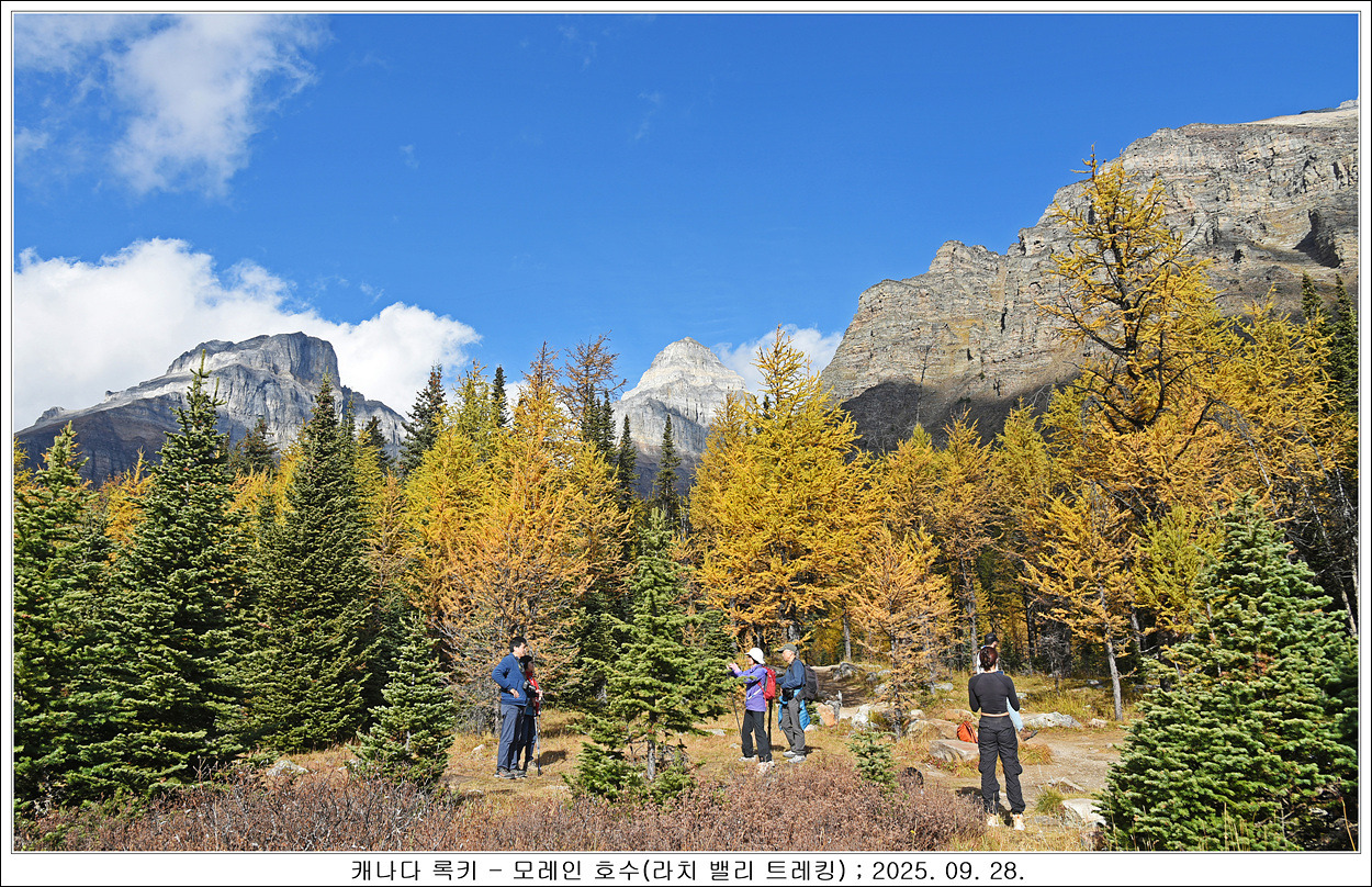 오늘은 모레노 호수와 라치벨리 트레킹입니다, 라치벨리 주변은 낙엽송의 노란 단풍으로 록키는 가을 여행도 괜찮다는 생각이 듭니다