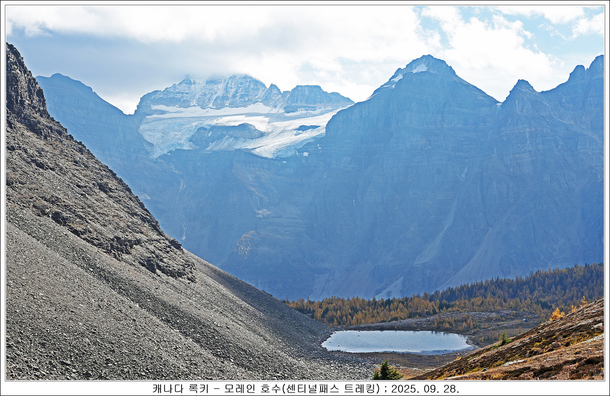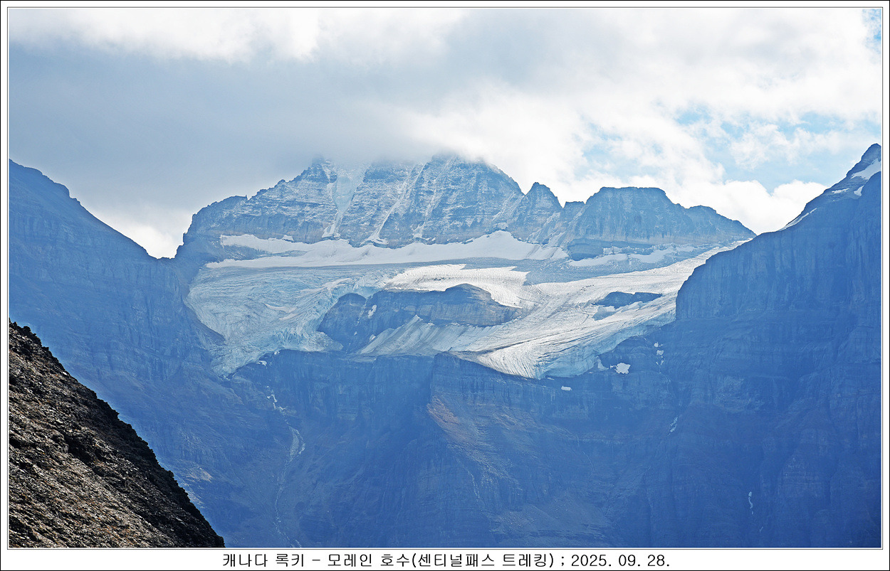 올라가면서 보는 모레인 호수 건너편의 설산과 빙하가 보입니다