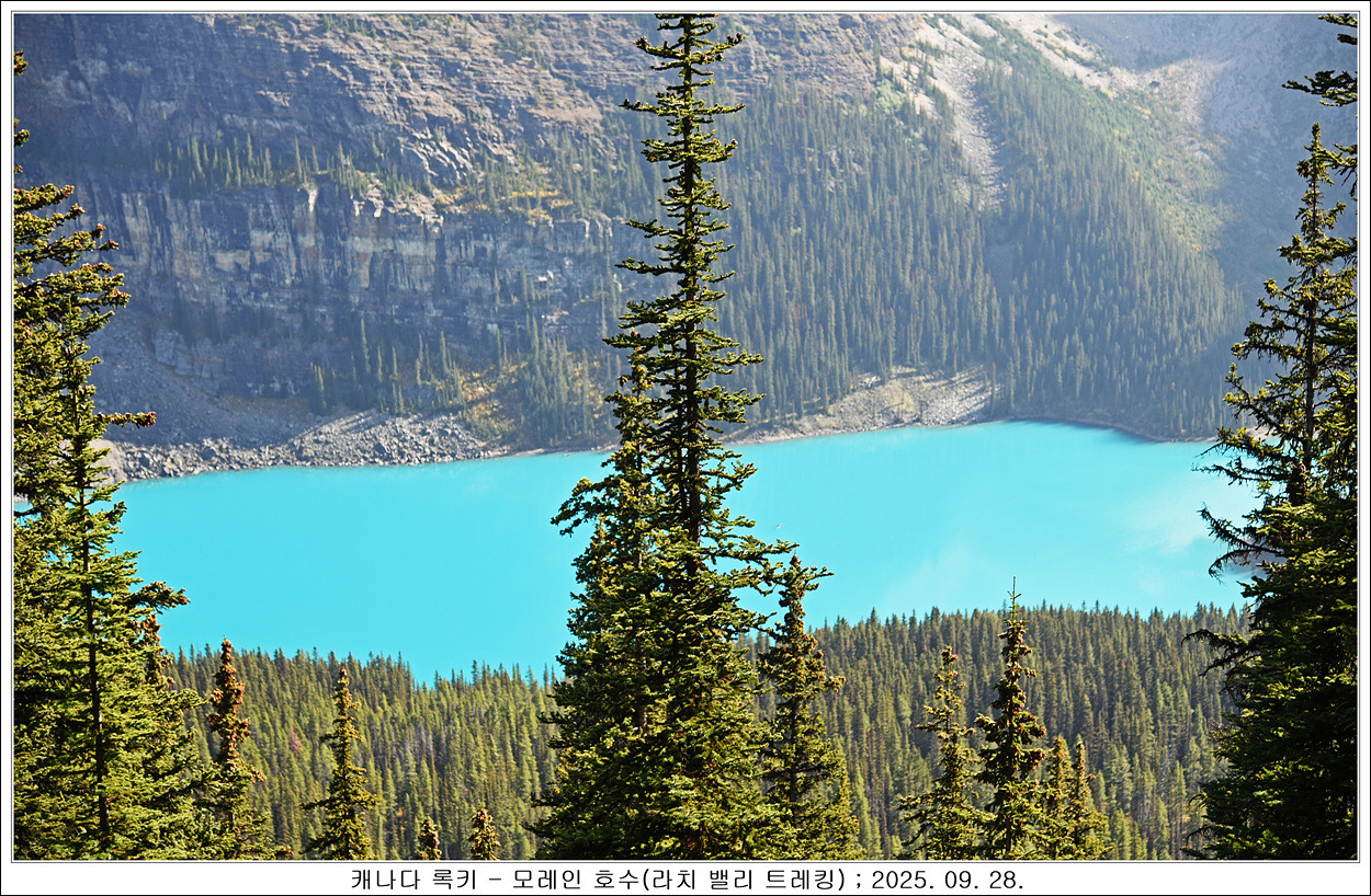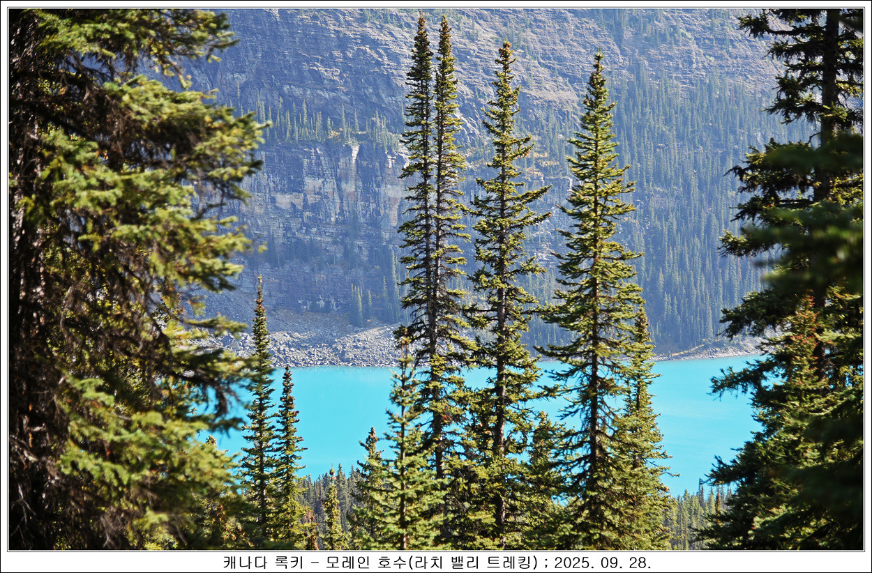 내려가면서 모레인 호수를 나무 사이로 봅니다
