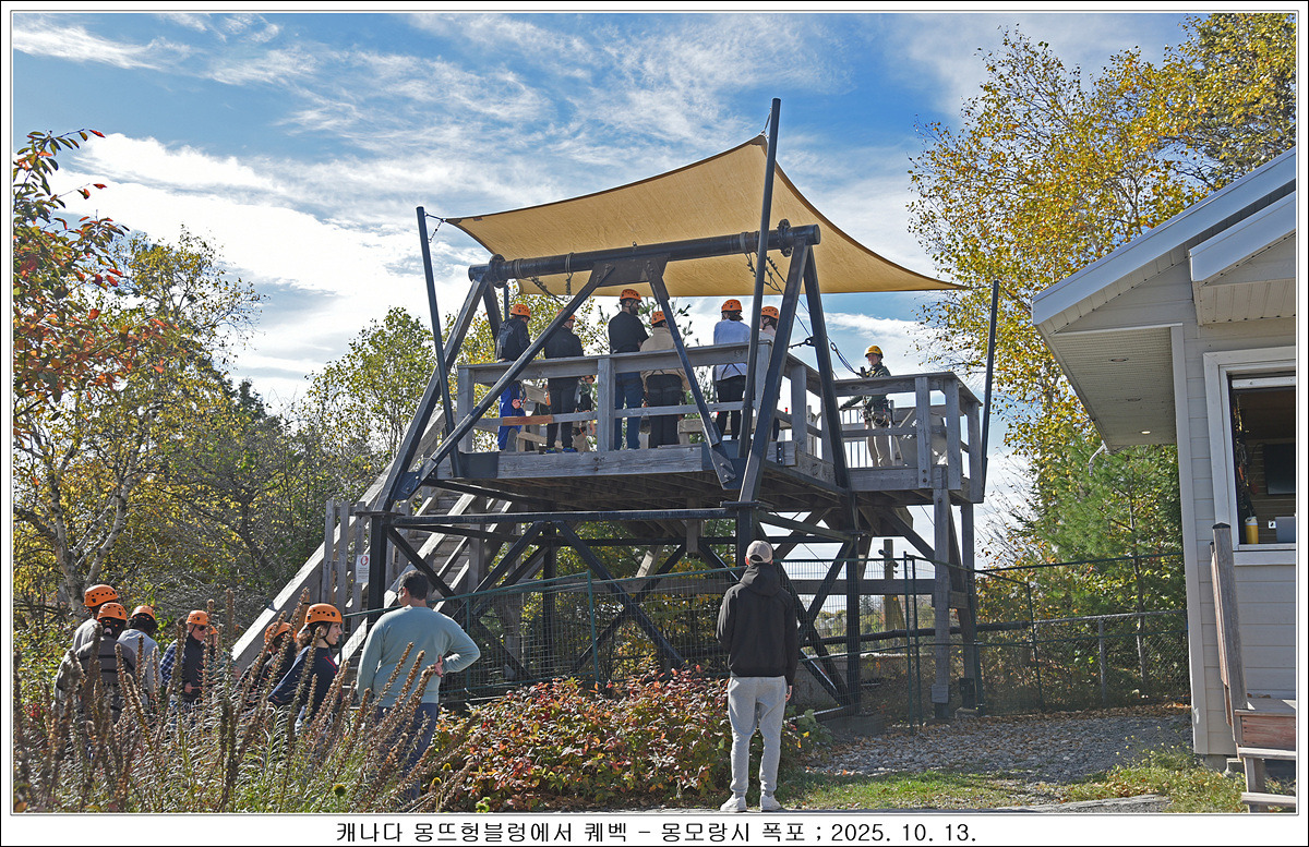 계단을 따라 위에 까지 올라갔습니다, 몽모랑시 폭포 앞으로 지나가는 집라인 입니다